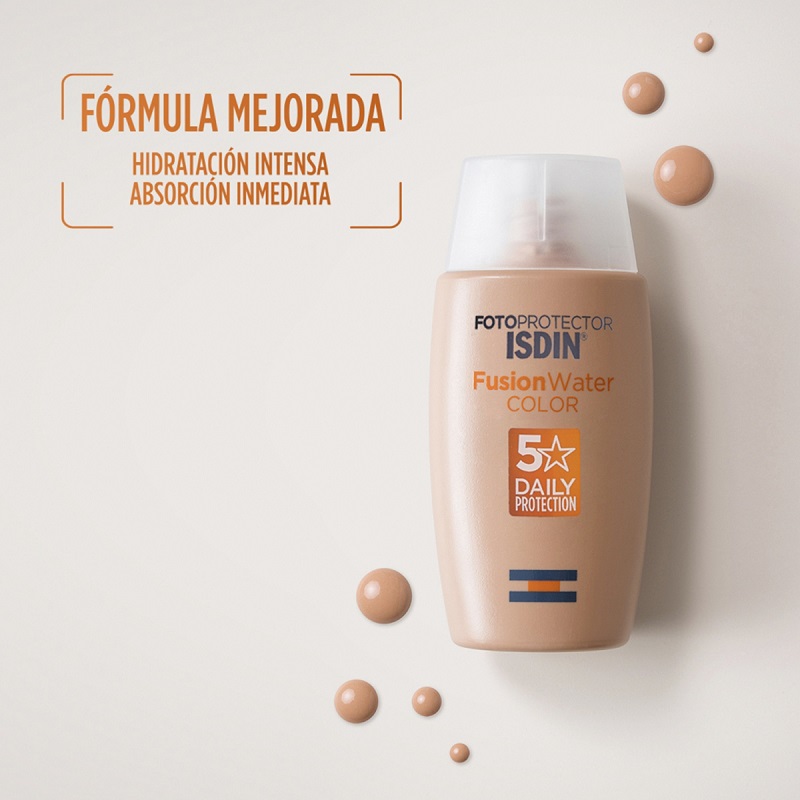 ضدآفتاب فیوژن واتر رنگی ایزدین دارای رنگ بژ طبیعی است و سبک است و پوششی یکدست برای پوست ایجاد می کند.